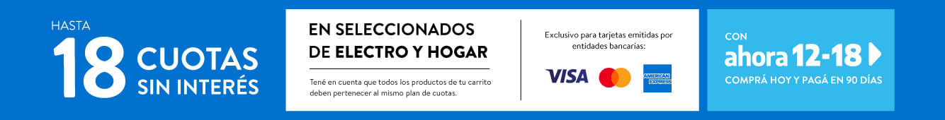 AHORA 6, 12 Y 18: CFT: 0,00%. TNA: 0%, TEA: 0% CUOTAS PARA QUE APLIQUE LA PROMOCIÓN: 12 CUOTAS O 18 CUOTAS SEGÚN INDIQUE CADA PRODUCTO. PROMOCIÓN VIGENTE EN WWW.WALMART.COM.AR, DESDE EL 01/01/2021 AL 28/02/2021 O HASTA AGOTAR STOCK INDICADO EN CADA PRODUCTO, LO QUE OCURRA PRIMERO, PARA LA COMPRA DE PRODUCTOS NACIONALES SELECCIONADOS CON TODAS LAS TARJETAS DE CRÉDITO VISA, MASTERCARD Y AMERICAN EXPRESS EMITIDAS ÚNICAMENTE POR ENTIDADES BANCARIAS DE LA REPUBLICA ARGENTINA. NO ACUMULABLE CON OTRAS PROMOCIONES Y/O DESCUENTOS VIGENTES. EL COSTO FINANCIERO TOTAL (CFT) VARÍA SEGÚN LOS CARGOS COBRADOS POR CADA BANCO. POR FAVOR REQUIERA ESTA INFORMACIÓN AL BANCO EMISOR DE SU TARJETA.
