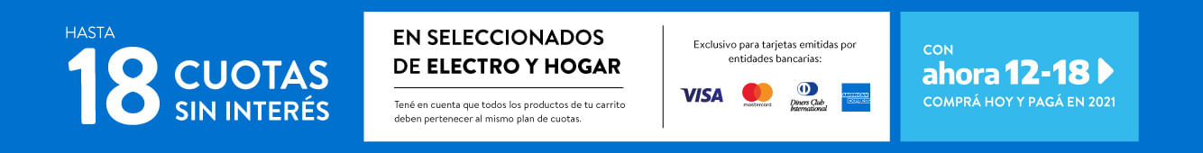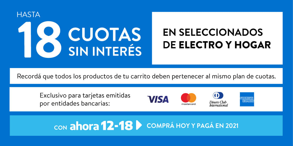 AHORA 12 Y 18: CFT: 0,00%. TNA: 0%, TEA: 0% CUOTAS PARA QUE APLIQUE LA PROMOCIÓN: 12 CUOTAS O 18 CUOTAS SEGÚN INDIQUE CADA PRODUCTO. PROMOCIÓN VIGENTE EN WWW.WALMART.COM.AR, DESDE EL 02/11/2020 HASTA 18/11/2020 O HASTA AGOTAR STOCK INDICADO EN CADA PRODUCTO, LO QUE OCURRA PRIMERO, PARA LA COMPRA DE PRODUCTOS NACIONALES SELECCIONADOS CON TODAS LAS TARJETAS DE CRÉDITO VISA, MASTERCARD, CABAL, DINERS CLUB Y AMERICAN EXPRESS EMITIDAS ÚNICAMENTE POR ENTIDADES BANCARIAS DE LA REPUBLICA ARGENTINA. NO ACUMULABLE CON OTRAS PROMOCIONES Y/O DESCUENTOS VIGENTES. EL COSTO FINANCIERO TOTAL (CFT) VARÍA SEGÚN LOS CARGOS COBRADOS POR CADA BANCO. POR FAVOR REQUIERA ESTA INFORMACIÓN AL BANCO EMISOR DE SU TARJETA.